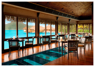 • Watch the vibrant fish of Bora Bora swim below the glass-panel floor in your over water villa